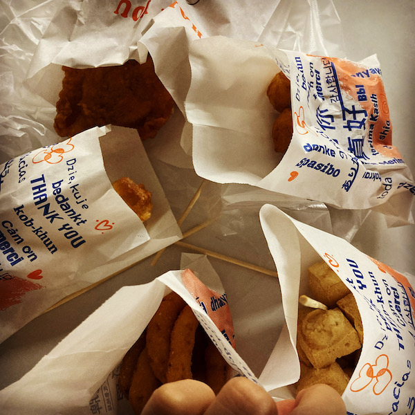 揚げ物のお店で色々頼んでシェアして食べる!エリンギ、百頁豆腐、オニオンリング、さつまいもボール、ジーパイ。