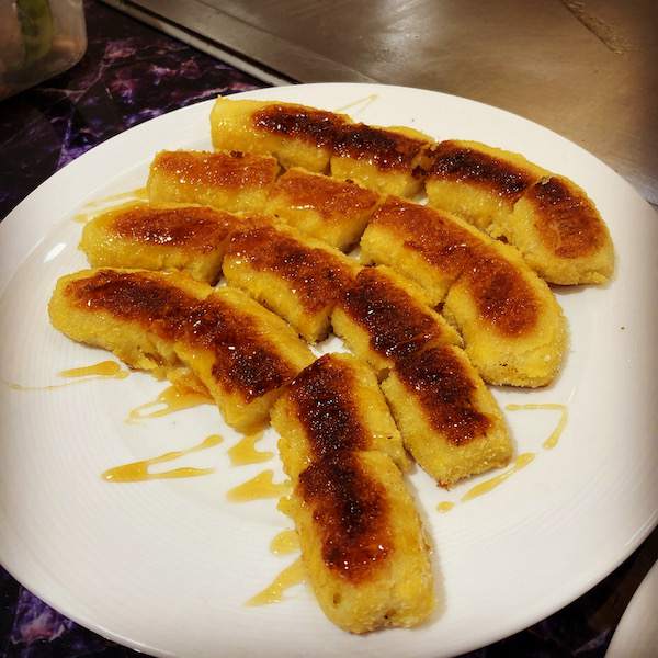 フライっつーか多めの油で揚げ焼きみたいにしたバナナだけど、小麦粉&たまご&パン粉がつけてあるので、フライっぽいのであります。