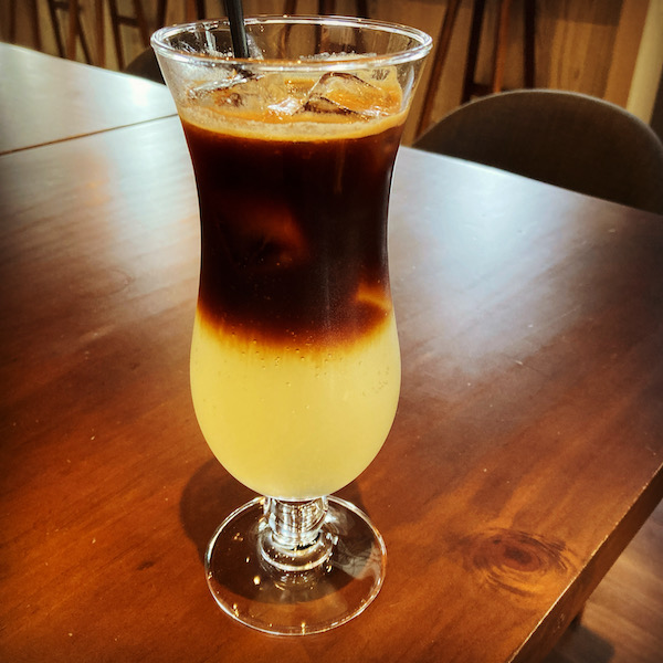 今日の飲み物は炭酸バージョンのレモンコーヒー。炭酸無いやつはミキサーでレモンとエスプレッソを全部混ぜるんだけど、炭酸の方はレモンと炭酸を混ぜた上にエスプレッソを注いで2層にするのです。スタッフの人に作り方を指導してもらいつつ、自分で作る。