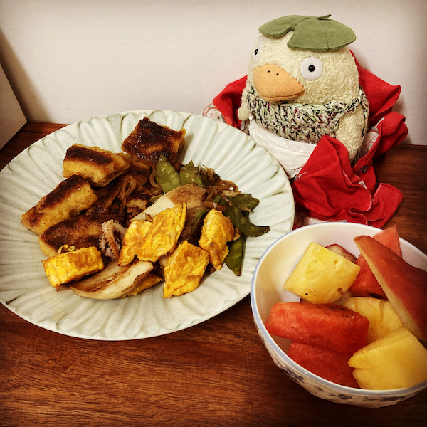 カットフルーツに飲むヨーグルトをかけたのと、レンチンたまごと、プリンをいただきやした。