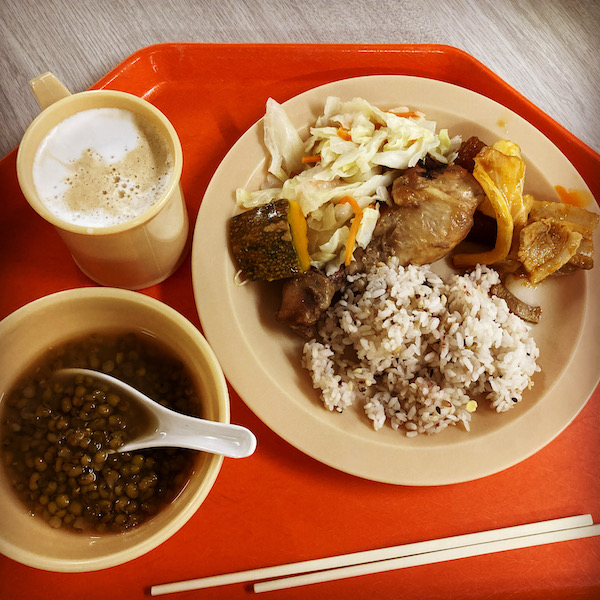 鶏手羽元と、豚肉&キャベツのトマト炒めみたいなやつがメインでした。野菜多めに取る。緑豆や小豆のスープに、お湯を足して薄めてたんだけど、氷を入れることにした!冷たくして食べても美味しい!