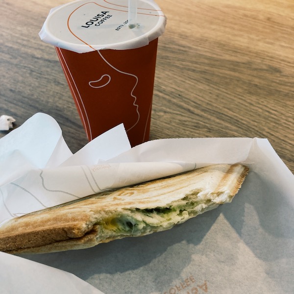 食べたいと思っていたバジルきのこのホットサンドと、抹茶ラテにしました。値上がりしてるっぽいな。160元もした〜。