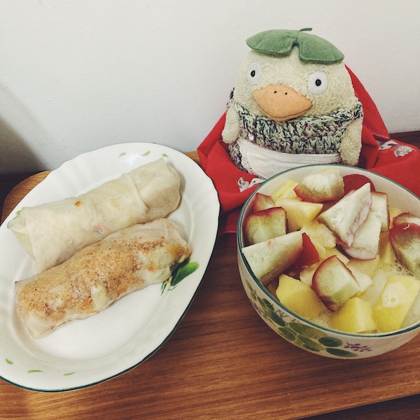 18:30くらいにお腹空いてきて、朝の春捲の残りを食べる!皮がもう一枚しか無いので、あと一枚だけ残ってた生春巻きの皮で包みました。